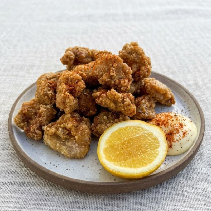 1. Cut the chicken thighs into ~2x2cm pieces, place in a bowl and stir through soy sauce, cooking sake, fresh grated ginger, and black pepper.