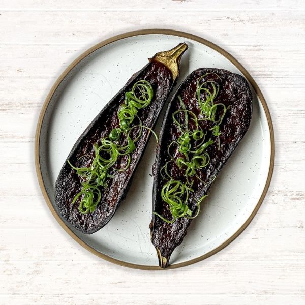 2. Cut the eggplant in half lengthwise, and score the cut face but cutting lines a few millimetres deep in a criss-cross pattern.
