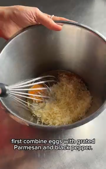 - In a large bowl, whisk the pepper, eggs, and parmesan and set aside