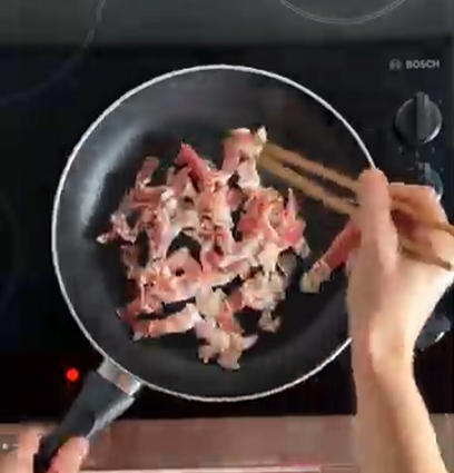 2. Finely dice the bacon, and cook on medium-low heat until the fat renders out and the bacon goes crispy. Keep in the pan, and set aside
