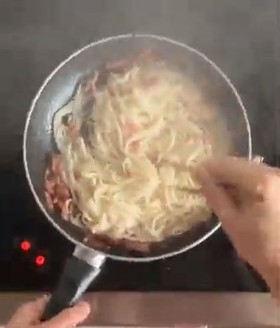 4. Bring the bacon pan back to the medium heat, and add the cooked noodles with the ¼ cup cooking water into the pan. Heat through and keep stirring until the the cooking water turns to a saucy consistency