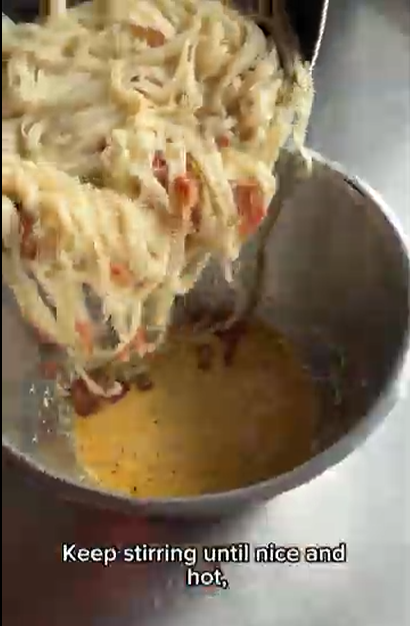 5. Immediately add this to the egg mixture bowl, and quickly and vigorously stir the hot noodles with the egg mixture until the cheese melts and you get a glossy sauce